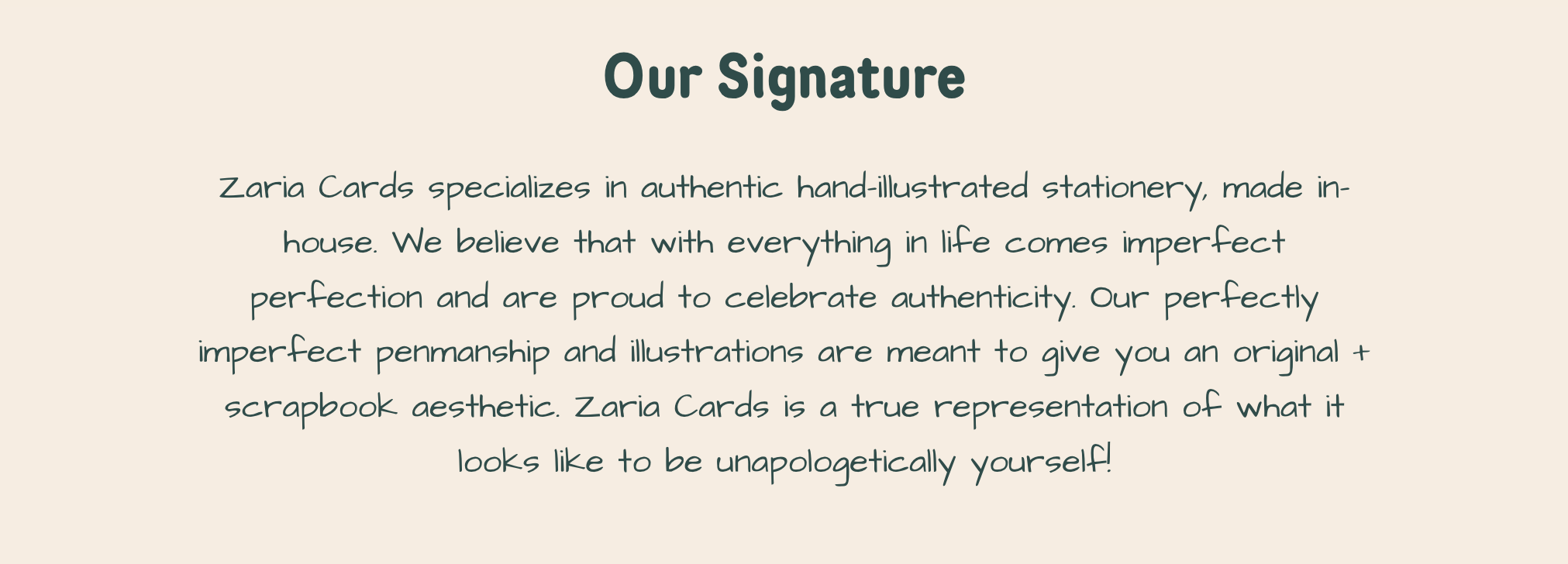 Brand philosophy statement capturing Zaria Cards’ values, tone, and creative vision.
